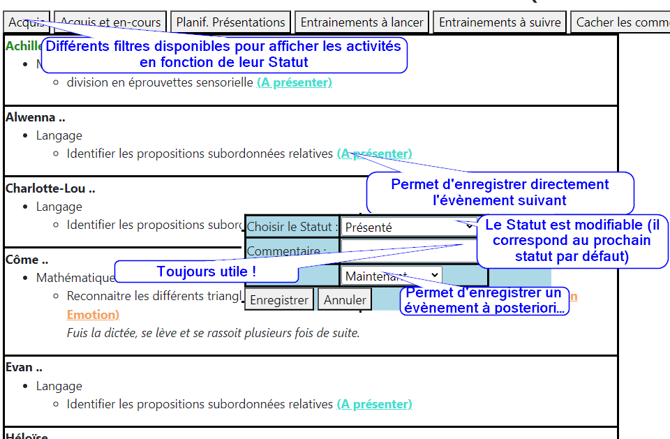 - Académique : pour un élève et une activité, on peut alors renseigner plusieurs évènements en fonction du Statut (A présenter, Présenté, A entrainer, Entrainement, et Acquis)