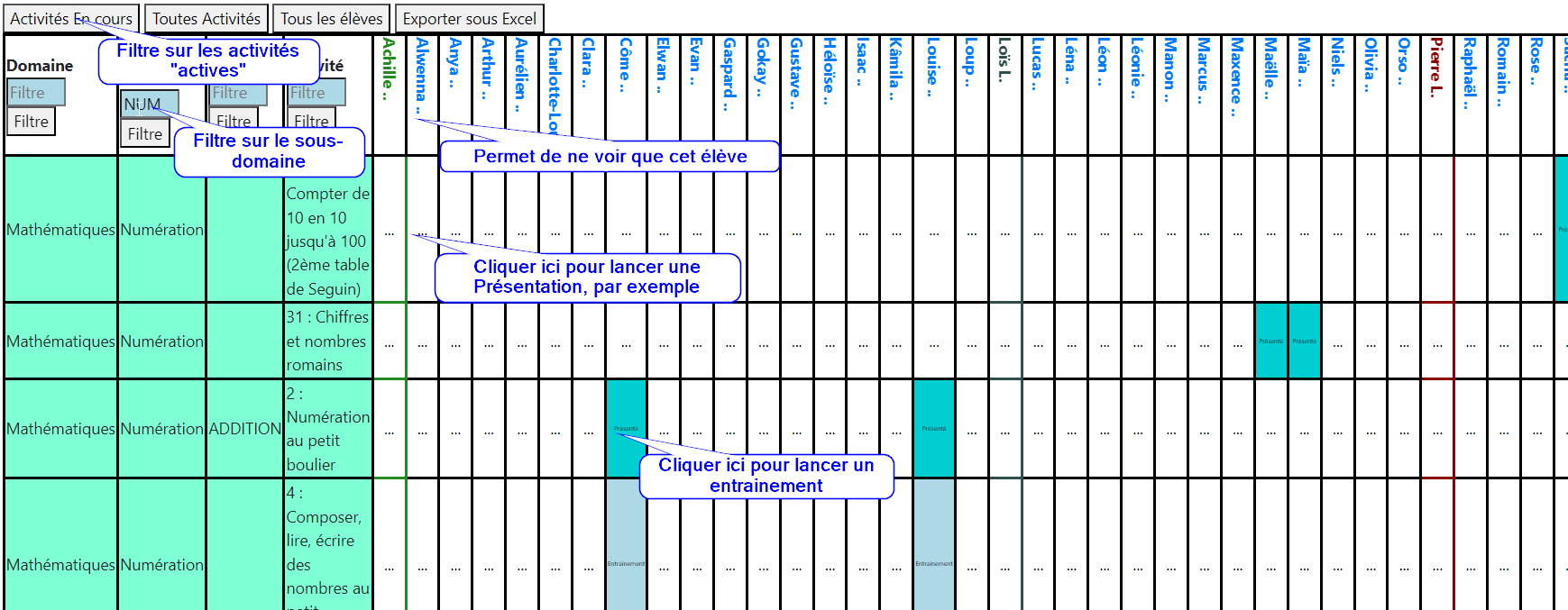 - En passant par la Progression globale : permet de voir l'ensemble des activités (utiliser les filtres sur les domaines, sous-domaines, chapitres, activités) sur tous les élèves